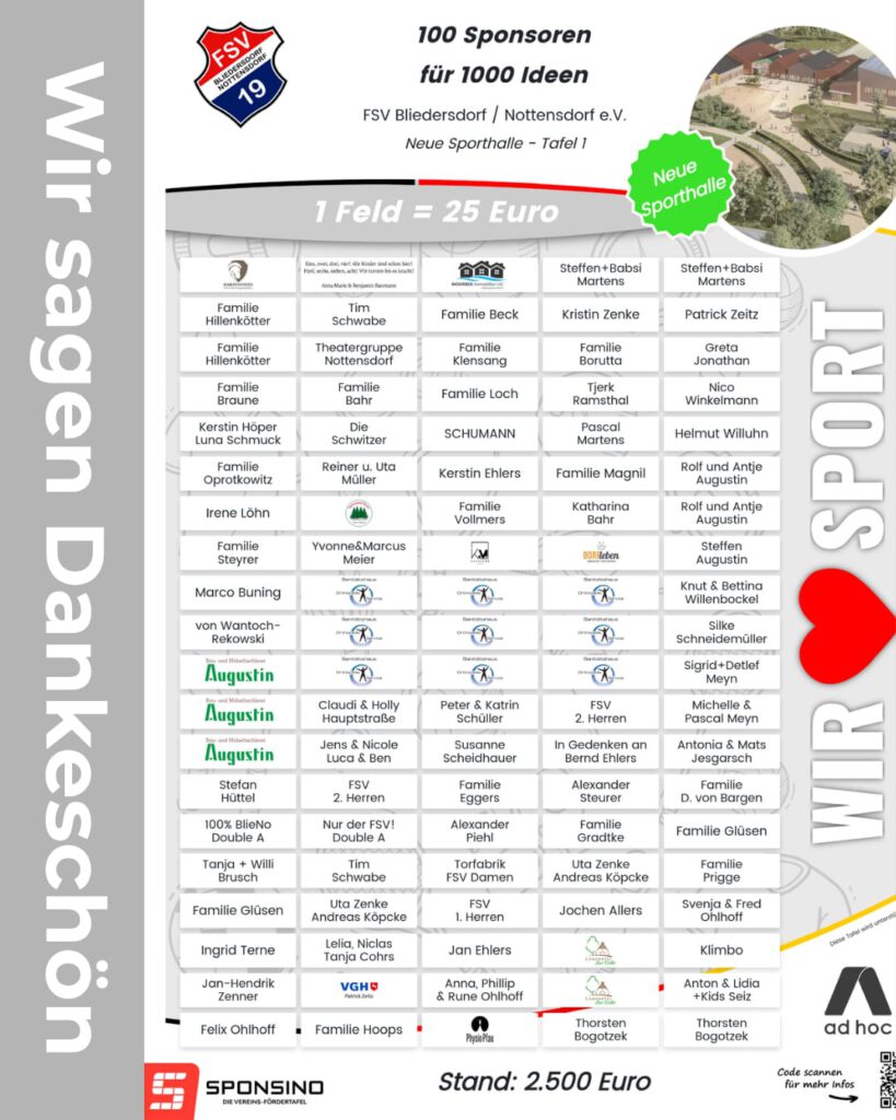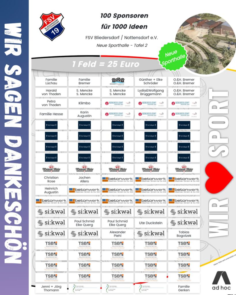 Der FSV Bliedersdorf / Nottensdorf e.V. freut sich sehr über den erfolgreichen Abschluss einer besonderen Spendenaktion: Dank zahlreicher Unterstützerinnen und Unterstützer konnten zwei Spendentafeln mit einem Gesamtwert von 5.000 € realisiert werden.